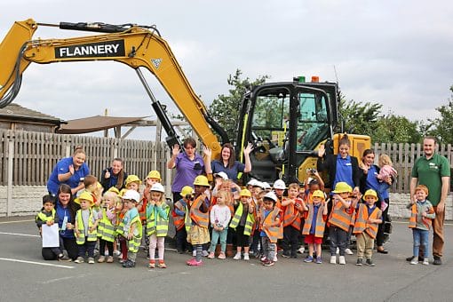 ‘The children at Footsteps Nursery were incredibly engaging,’ said Chris Matthew, Flannery Strategic Manager, ‘from their questions to their willingness to sit in the cab of the machine (and press every possible button – ignition disabled of course!).